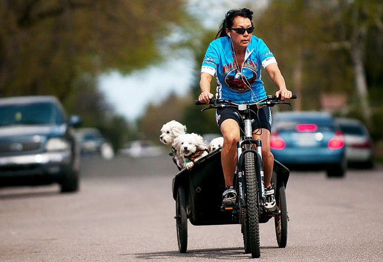 Emy Minnich rides her bike down California Street with her three Maltese dogs in tow Friday afternoon in Kalispell. “We’ve been training for the Spartan Race,” Minnich said. “They love the rickshaw rides.”