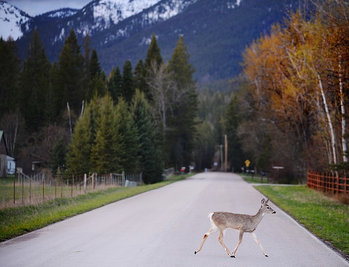 A deer crosses Haskill Basin road at dusk on Monday, May 5, in Whitefish. (Brenda Ahearn/Daily Inter Lake)