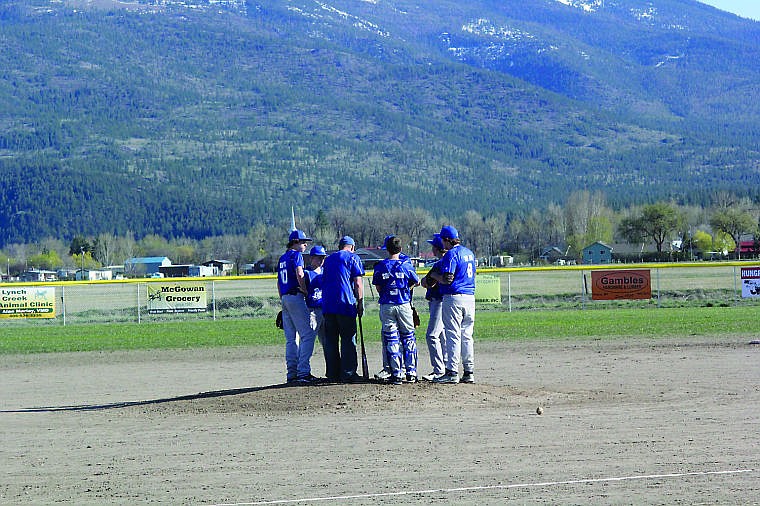The Plains Royals meet on the mound, shortly before the start of the game.