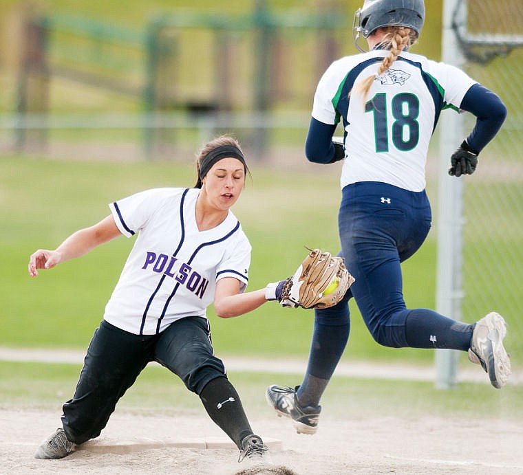 Polson first baseman Kaelen Wall (left) catches a throw to get the force out on Glacier's Ali Williams (18) Thursday afternoon during Glacier's loss to Polson at Kidsports Complex in Kalispell. May 8, 2014 in Kalispell, Montana. (Patrick Cote/Daily Inter Lake)