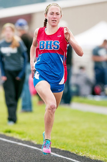 Bigfork junior Makena Morley leads the way in the 800-meter race Saturday afternoon during the Archie Roe track meet at Legends Stadium.