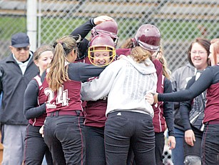 Brenna Garrison, center, is surrounded by her teammates for smacking a home run over the left field fence Saturday vs. Florence.
