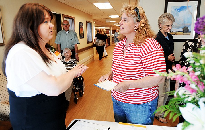April Webster, Expressions Director, welcomes guest to the open house including Michele Glazier of Kalispell, on Wednesday, May 14, in Kalispell. (Brenda Ahearn/Daily Inter Lake)