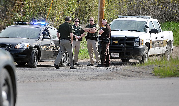 Montana Highway Patrol officers gather with a Flathead County sheriff's deputy at the conclusion of a pursuit that began in Creston on Thursday morning. (Brenda Ahearn/Daily Inter Lake)
