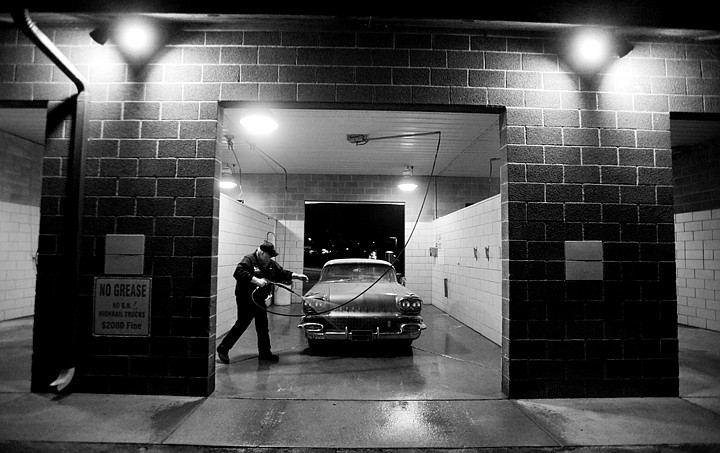 Richard Ebert of Cutbank washes his 1958 Pontiac Bonneville on Thursday evening, May 15, in Whitefish. On Friday he drove to Sand Point, Idaho to take part in the Lost in the 50s car show. (Brenda Ahearn/Daily Inter Lake)