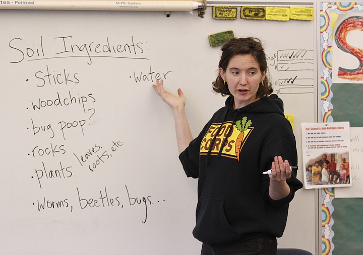 Zoe Tucker helped the students transform as part of her Food Corps lesson at Lakeside Elementary School last Wednesday, where students dug around in the dirt to figure out what makes up a rich soil needed to grow plants.