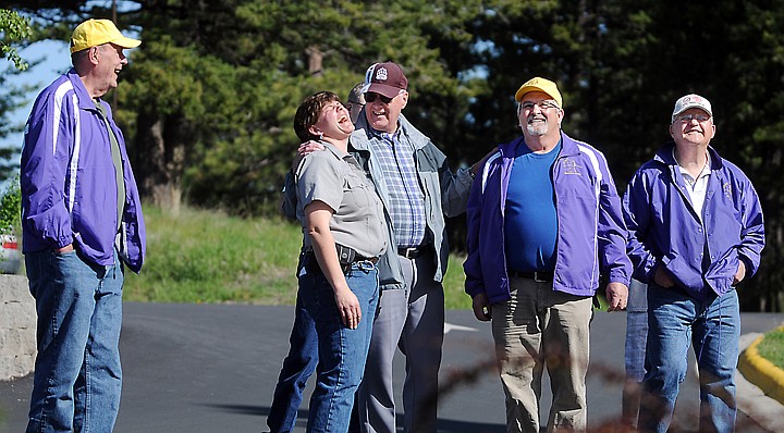 Park Manager Amy Grout, center, shares a celebratory laugh with members of the Kalispell Sunriser Lions after the installation of the new flagpole and raising of the flag on Thursday, May 22, at Lone Pine State Park. (Brenda Ahearn/Daily Inter Lake)