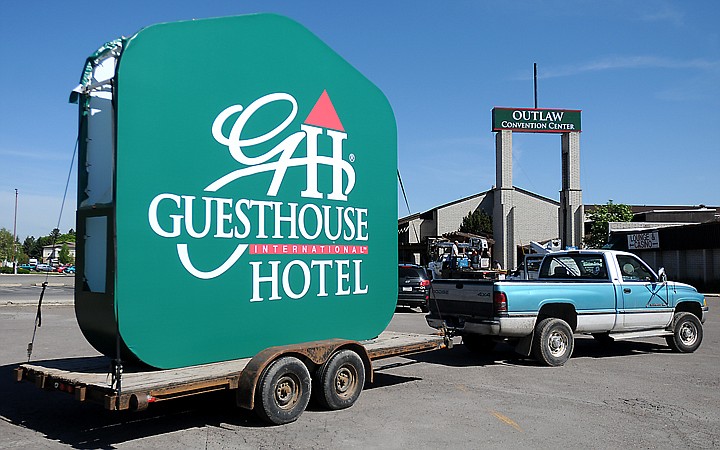 The new sign for the GuestHouse Inn and Suites and Outlaw Convention Center is prepared for installation on Friday, May 23, in Kalispell. (Brenda Ahearn/Daily Inter Lake)