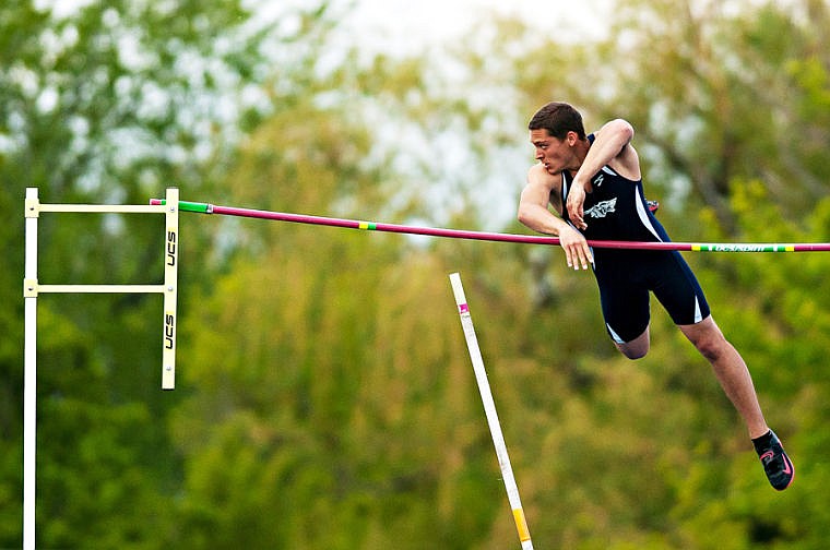 Glacier's Lonnie Sherman watches the bar as he clears 15' in the pole vault Friday afternoon during the first day of Western AA Divisional Track at Legends Stadium in Kalispell. (Patrick Cote/Daily Inter Lake)