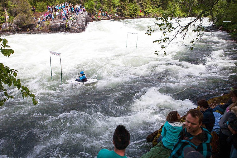 Spectators gather on both sides of the river to watch expert slalom runs Saturday afternoon during the 39th Annual Bigfork Whitewater Festival on the Swan River. The event continues Sunday morning with down river races starting at 10.