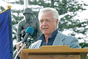 Terry Andreessen speaking during the dedication of the Veterans Memorial at Riverfront Park Monday evening.