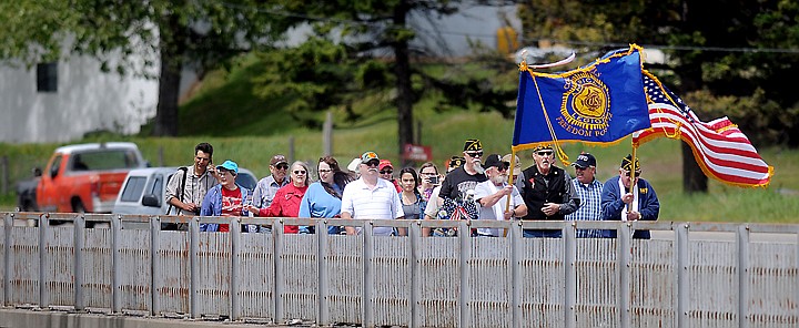 Veterans of Foreign Wars Post 72 and members of the community march to the Flathead River for the Memorial Day Ceremony on Monday, May 26, in Columbia Falls. (Brenda Ahearn/Daily Inter Lake)