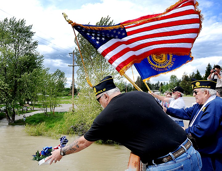 Vice Commander Pat Philbin of American Legion Post 72 throws a memorial wreath into the Flathead River in Columbia Falls on Monday. The wreath honors service members lost at sea. (Brenda Ahearn/Daily Inter Lake)