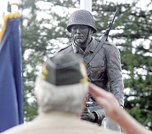 Larry Pitcher saluting during dedication of Veterans Memorial at Riverfront Park Monday evening.
