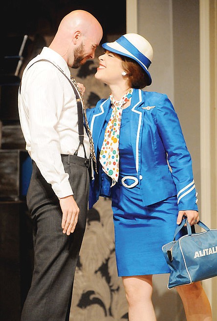 David Blair as Bernard and fiance number two Gabrielle, played by Jenna Kubiak, at the dress rehearsal of "Boeing Boeing" at the O'Shaughnessy Center in Whitefish on Tuesday, May 27. (Brenda Ahearn/This Week in the Flathead)