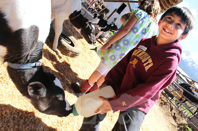 ST. IGNATIUS — Mission second-grader Nakai Sherman smiled from ear to ear, as the small, black and white calf near him tugged feverishly at the large bottle.