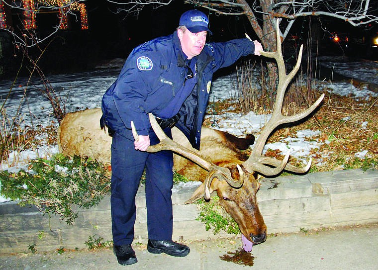 Boulder Police Officer Sam Carter poses Jan. 1, 2013, with an elk he shot in Boulder, Colo. Carter is on trial for charges stemming from the shooting of the elk.