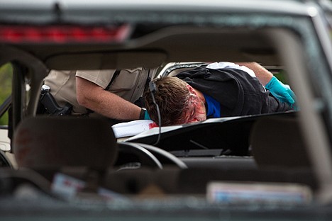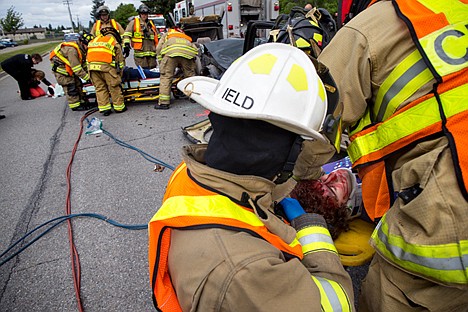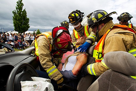 The mock crash was a step-by-step scenario, from the moment the 911 call is placed and answered to when the hearse arrives to retrieve the deceased and the helicopter retrieves the critically wounded. A few of the seven actors were smeared with theatrical blood. One simulated a passenger ejected through the windshield and the driver of the offending vehicle was placed "under arrest" after performing a field sobriety test. He was handcuffed and placed in the back of a Coeur d'Alene Police Department cruiser.