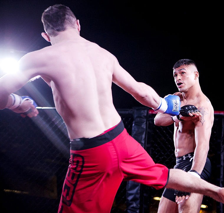 Joaquin Calderon (right) blocks a leg kick by Duran Flaget Friday night during Kalispell Kombat mixed martial arts fights at Majestic Valley Arena.
