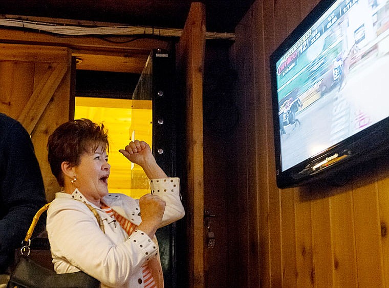 Sandy Christensen of Spokane cheers as California Chrome crosses the finish line as she watches the Preakness on Saturday afternoon at Scotty's Bar in Kalispell. "We came over just for this," said Christensen. May 17, 2014 in Kalispell, Montana. (Patrick Cote/Daily Inter Lake)