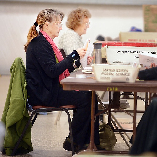 Election judge Sue Johnson of Whitefish and others sorting absentee ballots on Monday, November 3, at the Flathead County Fairgrounds. Residents were allowed to register to vote and pick up absentee ballots until yesterday at noon. Polls will open today at 7 a.m. (Brenda Ahearn/Daily Inter Lake)