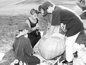 Pumpkin Project Adam Orr, Andy Davidson, Austin Davidson and Mike Tester carve a large pumpkin for Halloween. The pumpkin, which will have a ghoulish face and be lit with a candle, came from Canada. Joe Chopyak photo from the Oct. 28, 1994, files of The Western News.