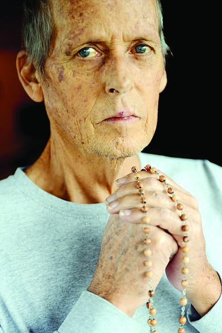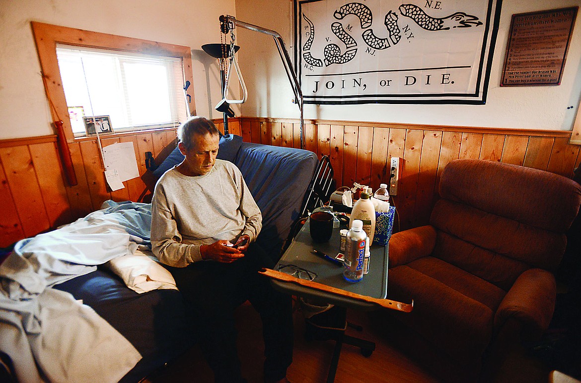 Now, as he spends his dwindling days in his small cabin near Somers, the swelling from his legs has moved to his gut. He loses his voice often, and purple spots speckle his jaundiced skin. Friends visit and eat donuts while spending time.
