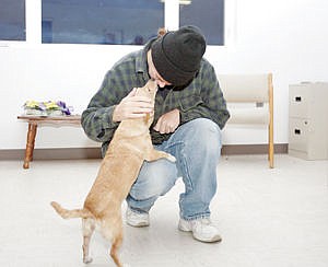 Karen Naulty gets a "kiss" from "Chula" Wednesday at Libby Airport.