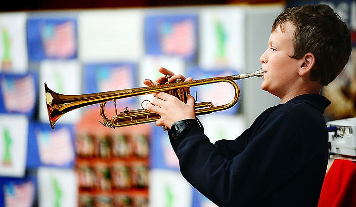 Seventh grader Keigan Knutson plays Taps at the Veterans Day program at Trinity Lutheran on Monday, November 10, in Kalispell. (Brenda Ahearn/Daily Inter Lake)