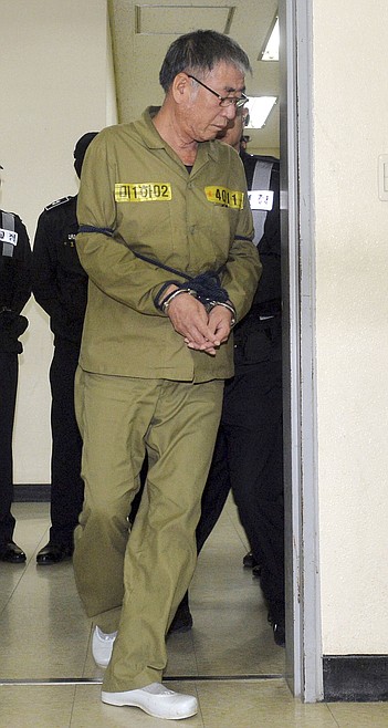 Lee Joon-seok, the captain of the sunken South Korean ferry Sewol, arrives for verdicts as the ship's crew members are charged with negligence and abandonment of passengers in the disaster at Gwangju District Court in Gwangju, South Korea, Tuesday, Nov. 11, 2014. South Korea said Tuesday it has ended underwater searches for the remaining missing people from April's ferry disaster that killed more than 300 people in one of the country's deadliest disasters in decades. (AP Photo/Yonhap, Hyung Min-woo) KOREA OUT