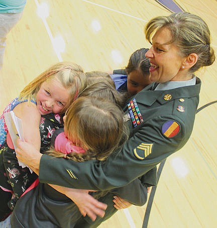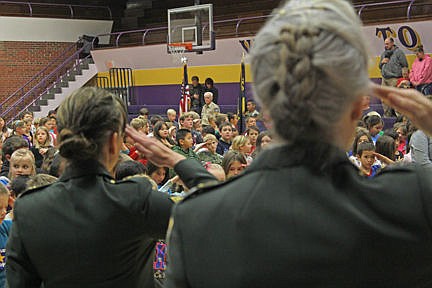 Linderman teacher and retired Army Stf. Sgt. Mona Friday, left, and Judge Kim Christopher, a retired Army Capt., salute the color guard along with dozens of students.