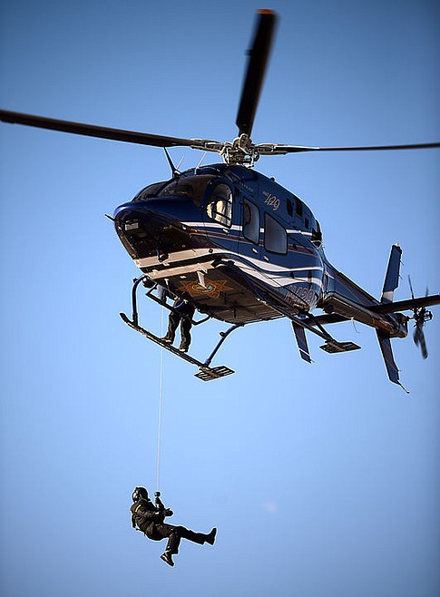 Undersheriff Dave Leib of the Flathead County Sheriff's Office takes part in a training exercise with Priority One Air Rescue out of Mesa Arizona on Thursday, November 13, at the Kalispell City Airport. Priority One are hoist specialists, Sheriff Chuck Curry said they will be working with the Sheriff's Office, training all aircraft crew members, for the next two weeks. (Brenda Ahearn/Daily Inter Lake)