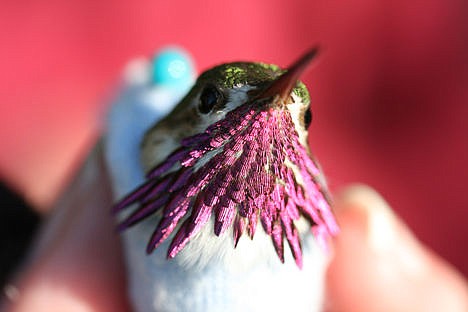 Her group last year caught a record 635 hummingbirds, including 105 recaptures, during nine capture days between May and August on private property located about a mile south of Idaho City. Key to capturing hummingbirds, she said, is to go where there is an established feeding site put up by humans that has had time to attract generations of hummingbirds.