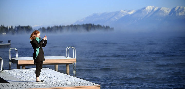 Danielle Martin of Edmonton, Alberta takes a photograph of the steam rising from Flathead Lake on Thursday morning, November 13, in Lakeside. Martin, who previously studied at the Youth With a Mission campus, is in the valley visiting friends. She said she has always loved the sight of those mountains. (Brenda Ahearn/Daily Inter Lake)