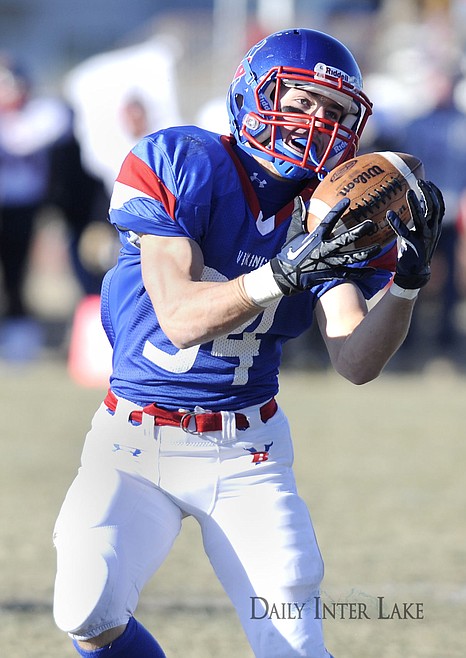 NOTE: Bigfork receiver Jonathan Landon was injured in the second quarter during a third-down pass play that started at the Bigfork 2-yard line with 2:32 remaining. He caught a pass from Sandry for a first down, but could not hang on after being sandwiched by two Huntley Project defenders. Landon was removed from the field on a stretcher and taken to Kalispell Regional Medical Center. “They did some X-rays and everything is OK,” Emslie said. “He will be sore for a few days, but he will be all right.” Emslie said Landon injured his neck on the play. “When I was out there, he couldn’t squeeze my hand.”