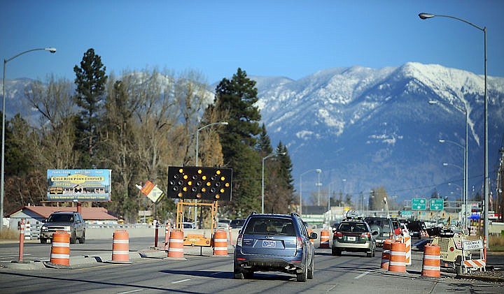 Traffic is funneled through restricted lanes on U.S. 2 heading east in Evergreen on Monday. The highway was expected to be restored to two-lane traffic on Monday night. (Brenda Ahearn/Daily Inter Lake)
