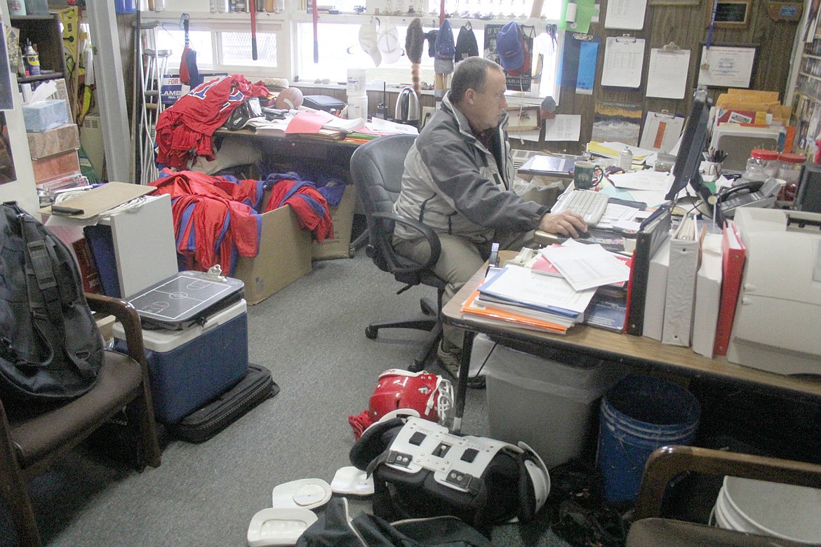 Superior High School Principal and Athletic Director Allan Labbe work in his office surrounded by football gear. Labbe recently announced he was stepping down as head football coach.