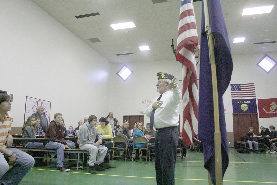 Students at the St. Regis High School held a breakfast to honor the men and women who have served their country on Veteran's Day. Fred Gillott, standing, led the group in the salute.