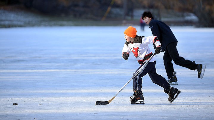 Benjamin Pilskalns, 11, and his brother Josiah, 17, in back, ice skating at Woodland Park on Wednesday, November 19, in Kalispell. (Brenda Ahearn/Daily Inter Lake)