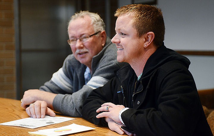 Shawn Sharp, right, and John Blanchard of Kalispell sit down for an interview after becoming the first same-sex couple to get a marriage license at the Flathead County Courthouse on Thursday morning.