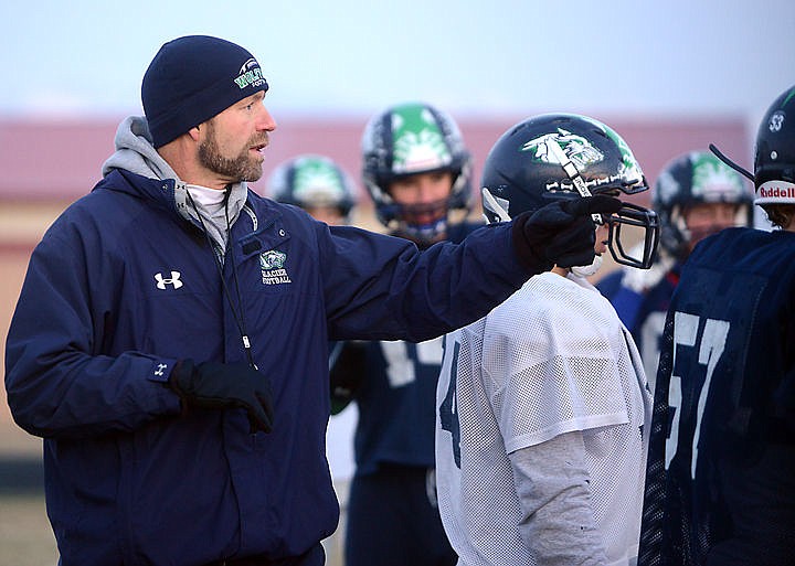 Grady Bennett, Glacier Wolfpack head coach, keeps close watch on players as they practice Wednesday evening. Bennett and his undefeated Wolfpack play C.M. Russell for the state championship today at 7 p.m. at Legends Stadium in Kalispell.