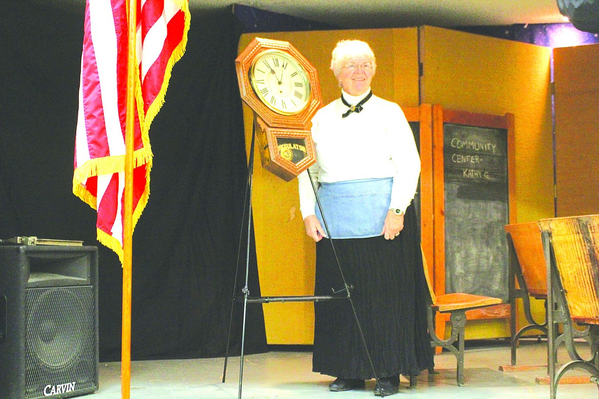 Judy Stephens of the Paradise Elementary School Preservation Committee presents the historic timepiece to the crowd at Paradise Elementary last week.