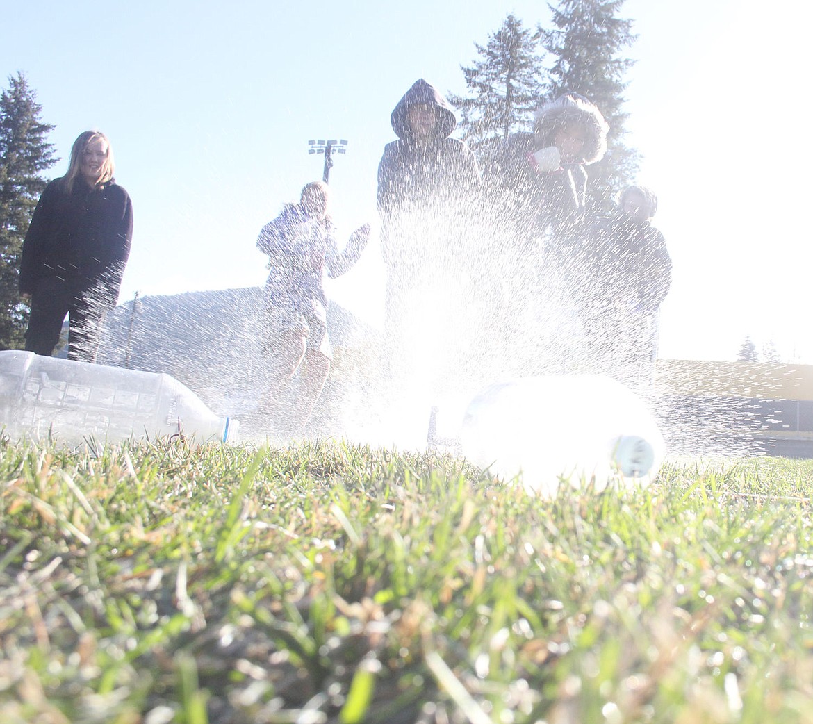 A water and air rocket made out of a soda bottle sprays water as it shoots toward the camera. Timberly Kelly's sixth grade class was learning about the physics of flight during the experiment.