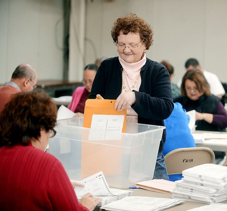 Flathead County Finance Director Sandy Carlson and others recount more than 30,000 ballots on Friday in Kalspell. The recount confirmed that voters narrowly defeated a request to form an emergency dispatch district. (Brenda Ahearn/Daily Inter Lake)