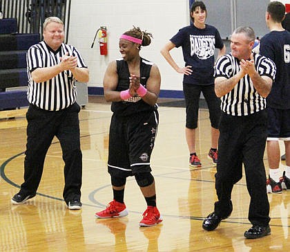 The basketball show followed a loose script, and at times Lade Majic pulled down both Bennetts on the team, first Connor and later A.J., for a pre-planned foul routine that included the refs, Ken Yount and Travis Blackmore. Majic hid behind her ‘parents,’ Fred and Helen Nystrom in the crowd for the second foul, pulling her ‘mom’ Helen down to the court to face down the ref on her behalf.