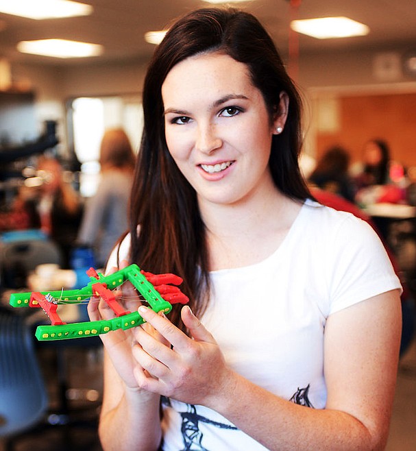 Donaldson displays a prosthetic hand created by a 3-D printer at Whitefish High School.