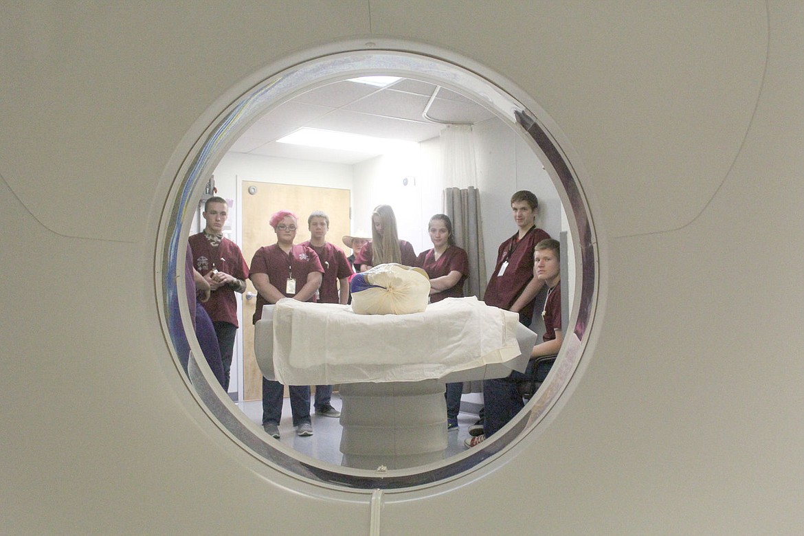 Students see a demonstration of the machine that performs CAT scans at the Mineral Community Hospital.