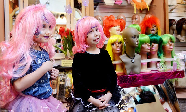 Kiersten Koelzer and Lilia Sterkel, both 5, play dress-up in pink wigs at Picture Me Makeover Studios in Kalispell. The girls both have the autoimmune disorder alopecia areata, which caused their hair to fall out.