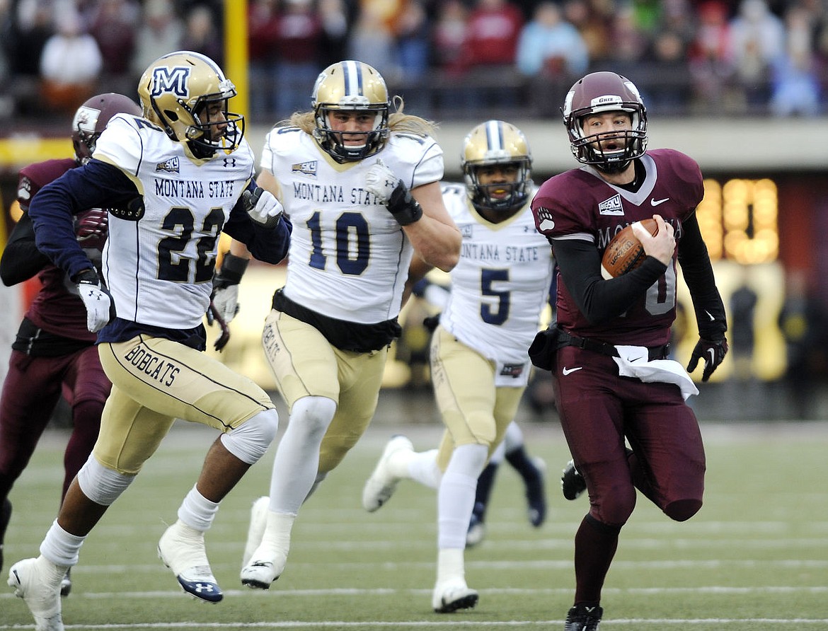 Montana quarterback Jordan Johnson runs away from a crowd of Montana State defenders during a long run in the first quarter of the Brawl of the Wild. (Aaric Bryan/Daily Inter Lake)