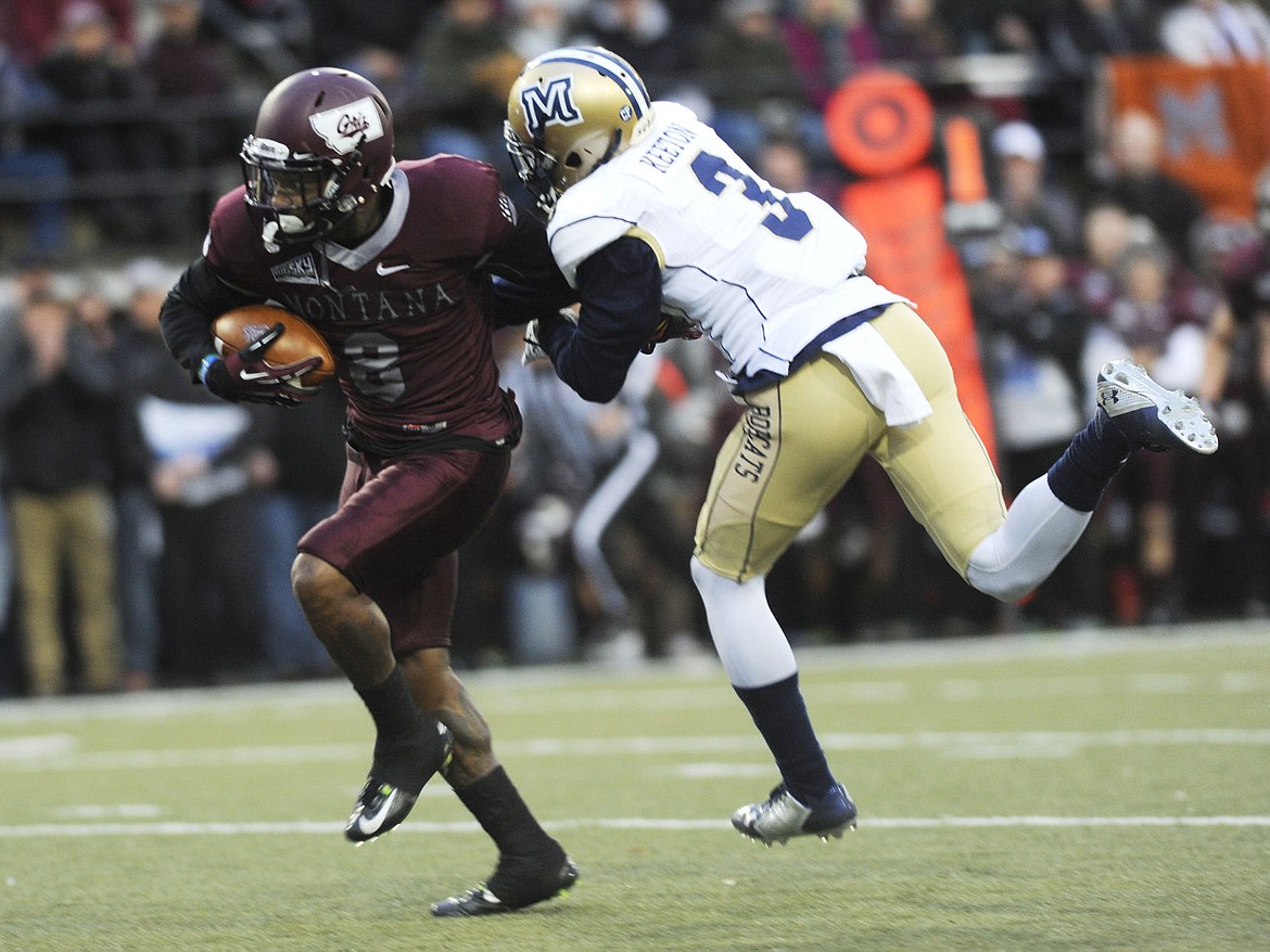 Grizz running back Travon Van attempts to break the tackle of the Bobcat's Bryson Keeton after a catch during the second quarter in Missoula. (Aaric Bryan/Daily Inter Lake)